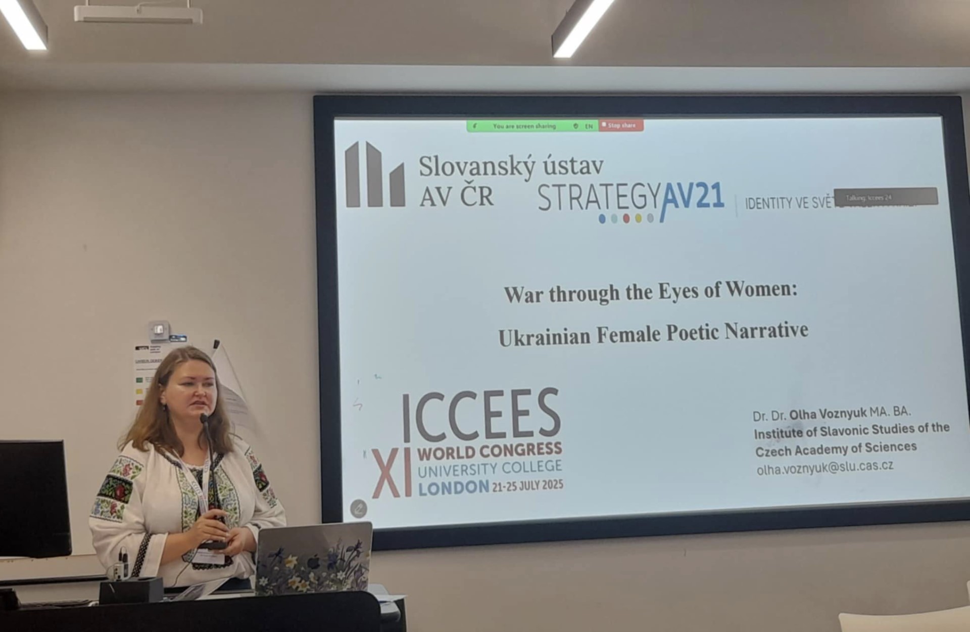 Na mezinárodní konferenci "International Council for Central and East European Studies (ICCEES) – XI World Congress", která se uskuteční ve dnech 21. až 25. července 2025 na University College London, Institute of Education, představí Olha Voznyuk výsledky svého dlouhodobého výzkumu. Pro konferenci zorganizovala panel „Ukrainian Culture in the Aftermath of Russia’s Full-Scale Invasion: Challenges and Perspectives“, který sdružuje badatelky z Ukrajiny, Německa, Rakouska a USA. Zároveň na konferenci vystoupí s dvěma příspěvky: „War through the Eyes of Women: Ukrainian Female Narrative“ a „Representation of the Reality of the Ongoing Russia’s War on Ukraine in Ukrainian Contemporary Novels".
