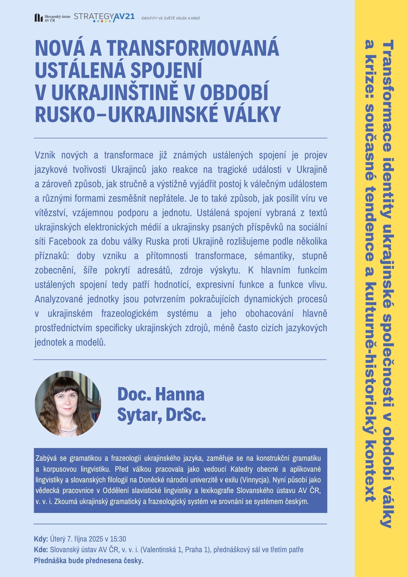 Hana Sytar ze Slovanského ústavu AV ČR přednese 7. října přednášku "Nová a transformovaná ustálená spojení v ukrajinštině v obdoví rusko-ukrajinské války". Poukáže v ní, jak tato slovní spojení vyjadřují postoj k válečným událostem, jak různými formami zesměšňují nepřítele a jak posilují víru ve vátězství.