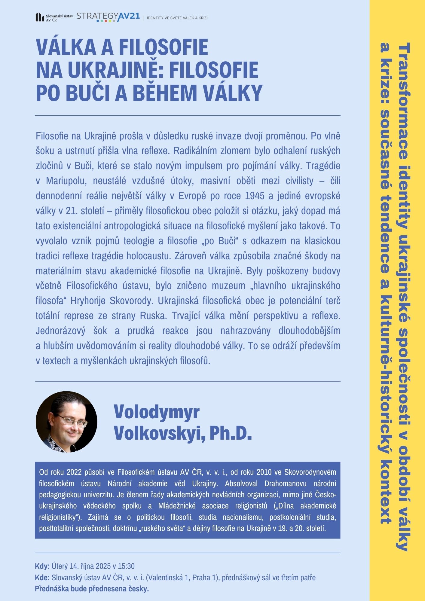 Válka na Ukrajině výrazně poznamenala tamější filozofii. Zločiny v Buči daly vzniknout pojmům jako teologie a filozofie "po Buči". Kromě toho válka způsobila značné škody na materiálním stavu akademické filozofie – bylo například zničeno muzeum filozofa Hryhorije Skovorody. Blíže o těchto tématech bude mluvit Volodymyr Volkovskyi z Filosofického ústavu AV ČR 14. října 2025 během své přednášky "Válka a filozofie na Ukrajině: Filozofie po Buči a během války".